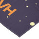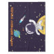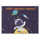 Vestuário de mesa de aniversário com fundo azul escuro com estrelas amarelas espalhadas à volta. Camadas sobre o topo é uma ilustração de um homem espacial vestindo um traje astronauta branco flutuando sobre a lua. Ao longe está um planeta com anéis e um foguete voando para o céu procurando novos mundos para explorar.