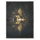 Composição de preto e ouro desenhada artificialmente, simétrica, asas de pássaros, ouro, crânio de pássaros decorado com padrão dourado sobre fundo escuro e texturizado.Estilo gótico