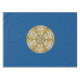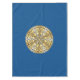 Uma mandala concêntrica, tipo rendas, em azul escuro, com pontos brilhantes, azuis e dourados, girados entre as camadas e um brilhante círculo de gradação de explosão solar atrás faz um design divertido que traz à mente um céu noturno estrelado e um dia ensolarado brilhante com uma imagem.