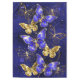 Composição de borboletas luxuosas de safira e joias de ouro em fundo azul texturizado.