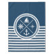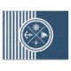 Design náutica com símbolos náuticos (âncora, barco à vela, roda à vela, bússola) decoração em fundo listrado branco e azul marinho.
