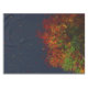 Olhando para os galhos de uma torre no outono. As folhas em queda de burgundy, vermelha, ouro, laranja, amarela e azul brilham contra o céu azul profundo.