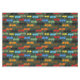 Um grupo asa de dragões nas cores de preto, marrom, vermelho, laranja, amarelo, azul e verde abre asas através de um fundo verde escuro profundo que sobe para cima. Os dragões são desenhados num estilo de tatuagem tribal.