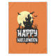 Feliz ilustração do design de texto de Halloween com decoração assombrada de casa, cemitério e morcegos na lua de cheio em fundo laranja