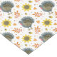 Um padrão aquoso de perus de cinza azul, girassóis e bolotas ouros, corações e folhas cor de laranja contra fundo branco
