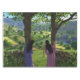 Garotas gêmeas se destacam por trás de duas árvores em uma luva verde-luxuosa entre colinas rochosas, cheias de pequenas fazendas e sebes e muros de pedra e regadas por um riacho espumante que desce em cascata pelas colinas.