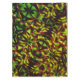 Desenho que lembra fitas interligadas em verde ligeiramente amarelado e castanho avermelhado manchado que lembra algo queimado. A imagem sofreu um efeito 'esculpido' que causou um escurecimento das cores e alguma percepção de brilho em algumas partes e pequenas manchas enrugadas em outras.