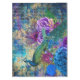 Design de Pavão Ilustrado e Flores Azuis e Púrpuras com fundo azul e amarelo verde e cobertura de escrita manual