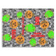 Divertido decoração de Halloween. Bombas laranja com olhos vermelhos, abóboras zombie verdes com aparência de gotículas de sangue. Texto festivo em texto vermelho, Boo, Eek, Feliz Dia das Bruxas, Trick-or-Treat. O fundo é quadrado preto de cinzas com branco. Design original © TamiraZDesign.