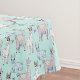 Tablecloth com um padrão bonito com lhamas brancas. Um está deitado, um está segurando uma flor na boca dele, e um está olhando para você desconfiadamente. Estes animais têm um grande caráter encantador.