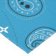 Esta mesa apresenta um padrão de formas paisley em preto e branco no estilo de uma bandana clássica. O impressão paisley é colocado sobre um fundo azul. É perfeito para dar à sua mesa uma sensação no país com um toque ocidental.