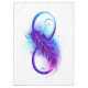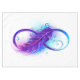 Símbolo do infinito com uma bela pena pintada em cores vibrantes roxas e azuis sobre um fundo branco.