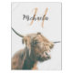 Monograma inicial do retrato das vacas altas. Fotografia de um majestoso gado de terras altas, laranja-acastanhadas, num dia nevado, com fundo branco.