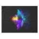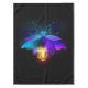 Voz mecânica, antiga, com lâmpada e asas finas brilha cor de laranja, roxo, turquesa sobre fundo preto. Estilo Steampunk.
