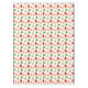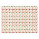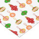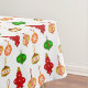 Tablecloth em um padrão antigo de ornamentos de árvores de Natal sorteadas, em vermelho profundo, verde-escuro, ouro macio e rosa, contra fundo branco