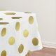 Ajuste uma mesa elegante com este pano de mesa branco bonito, com um teste padrão de bolinhas goldtone. Os guardanapo de harmonização de pano estão disponíveis.