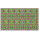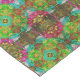Padrões geométricos vibrantes repetem-se por todo o design, apresentando modos intrincados, semelhantes aos caleidoscópios com uma mistura de tons verdes, azuis e cor-de-rosa. A disposição simétrica cria um efeito visualmente estimulante e colorido de tapeçaria.