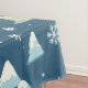 A imagem é um padrão de pinguins bonitos de desenho animado em um fundo azul com flocos de neve. Os pinguins são representados em várias poses: de pé, acenando, vestindo chapéus e cachecóis, e interagindo com elementos de inverno como derivas de neve, árvores de Natal e igloos. A estética geral é alegre, festiva e favorável à criança.