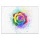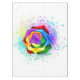 Rosa grande e florescente com pétalas arco-íris sobre fundo branco, pintadas com pedaços de tinta colorida e brilhante. 3d