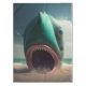 Shark sculpture on the beach, in the style of rendered in cinema4d, surrealistic grotesque, dreamlike illustration, dark cyan and green, concept art, gigantic scale, fish-eye lens