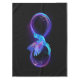 Símbolo luminoso, roxo e infinito com beija-flor azul voadora, luminosa, em fundo preto. Neon.