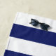 Personalize esta toalha náutica com seus nome do barco e ano de estabelecimento. Características de design a roda de um capitão dos azuis marinhos com uma beira circular da corda. O fundo é listras azuis e brancas. Tome-o à praia ou ao estoque acima de seu barco com eles para convidados. Faz o presente perfeito para amantes do barco.
