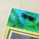 Aloha Summer. Bonito cena tropical durante dias quentes de verão. Aloha Summer é escrita em um roteiro de diversão amarelo ensolarado dentro de um quadro de três palmeiras com frondes soprando no oceano com céu azul. O plano de fundo tem um padrão em tons verdes azuis. Legal para homens ou mulheres. Design de fotografia original © TamiraZDesign.