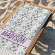 A intrincada design é complementada por borboletas, delfinírios e hydrangeas, com espaço para personalização.