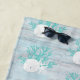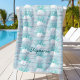 Esta toalha de praia costeira personalizada apresenta um padrão de brilho aqua, estrelas brancas e dólares de areia em um fundo rústico de madeira derivada, com nome de script. *Se você precisa de ajustes de design ou gostaria de mais produtos com este design ou outras maneiras, entre em contato comigo através do Zazzle.