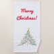 Características deste design de toalha de praia uma representação artística de uma árvore de Natal decorada, junto com o cumprimento morno, "Feliz Natal!".