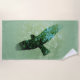 Esta toalha de praia personalizada é verde com uma fotografia alterada de um corvo preto voador transparente com topos de árvores visíveis atrás do seu corpo.