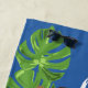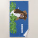 Esta toalha de praia personalizada apresenta um estilo realista de ilustração de um cão Pastor australiano e algumas folhas tropicais verdes contra um fundo azul real com um ponto para adicionar um nome em letras brancas em negrito.