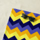 Uma toalha de praia com um design de chevrons giro e ombre em azul, amarelo e ouro.