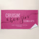 Toalha de praia cor-de-rosa magenta brilhante com nome personalizado e texto de manutenção para uma Festa de solteira Cruisin & Boozin.