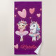 Esta torre de praia bonita apresenta uma bailarina e um unicórnio em tutu rodeado de corações cor-de-rosa sobre fundo roxo. Personalize com seu nome em uma fonte rosa-encaracolada. presente de excelente para pequenos dançarinos que amam balé e unicórnios.