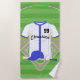 design de basebol bonito. Apresentando na frente uma camisa de basebol azul e listrada branca que pode ser personalizada com um nome e número, um boné de basebol azul, um taco de basebol e basebol. O fundo apresenta um campo de basebol.