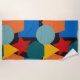 Esta toalha de praia tem um design Bauhaus de formas aleatórias em azul, lacre, amarelo, vermelho e laranja.