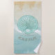 Este design de toalha de praia nas cores suaves do mar e da areia permite adicionar facilmente o seu próprio nome e texto usando o modelo fornecido. A simples imagem da concha de moluscos em um fundo angustiado e aquoso é realçada por um sotaque de onda em aqua e branco. Procure ID623 para ver a coordenação de elementos à beira-mar e produtos adicionais com este design.