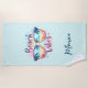 Citação: vibes de praia. Óculos de sol coloridos refletindo uma praia tropical. Fundo colorido de turquesa claro. Personalize e adicione seu nome.