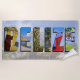 Divirta-se na praia e mostre seu amor pelo país de Belize com esta toalha de praia contendo fotos viagem de Ambergris Caye, Caye Caulker e ruínas Maias. Uma colagem de cores deslumbrante é imposta sobre uma cena de praia em resort tropical com palmeiras, e o tranquilo fundo azul de água do oceano, espero, fará você se sentir relaxado toda vez que você olhar para ela!