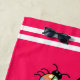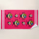 Uma toalha rosa brilhante de praia com besouros colorido espargueados espalhados pela toalha.