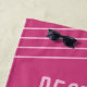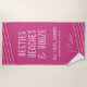 Toalha de praia personalizada, rosa-quente, com citação divertida de meninas "Besties Beaches & Booze" - ou qualquer texto personalizado - com nome, localização, ocasião e data personalizados com faixas diagonais e uma letra de assinatura casual de tendência. Mude as cores e as fontes para tudo o que você quiser e design sua própria toalha de praia de soleira usando a Ferramenta Design.
