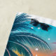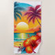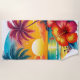 Um pôr do sol radiante pinta o céu em matizes, lançando um ouro brilhando sobre ondas tranquilas do oceano. A cena é moldada por palmeiras balançando, uma com frentes verdes e luxuosas e a outra em roxo arrojado, exumenta o encanto tropical. Flores de hibisco vibrantes em tons de vermelho, laranja e amarelo no primeiro plano, acrescentando uma abertura extra do paraíso. As ondulações suaves na água refletem o abraço quente do céu, criando uma mistura mesmerante de cor e serenidade. Esta imagem captura a essência de uma fuga tropical — onde a beleza da natureza encontra tranquilidade pacífica.