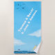 Summer and beach and towel! Lots of blue sky, just a few clouds, the sea with a small sailboat. But most importantly: your family or your name or your text in big white letters in the sky.
