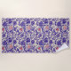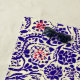 Padrão botânico floral abstrato azul e esbranquiçado com acentos de vermelho.
