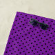 Esta toalha de praia apresenta um clássico design de bolinhas pretas sobre um fundo violeta roxo.