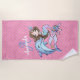 Costumada praia cor-de-rosa ou toalha de piscina de natação para uma menina de cabelo castanho escuro. Monograma com seu nome e inicial. Apresenta um golfinho, uma tartaruga, estrelas e outras criaturas marinhas com um fundo em escala de sereia rosa e dourada.