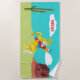 Você será a mais legal cowgirl da piscina de natação com esta toalha de praia personalizada. Apresenta uma ilustração retrógrada de campus de uma vaquinha num cavalo numa paisagem ocidental em cores brilhantes e está pronta para ser personalizada com um nome em letras vermelho-negrito.