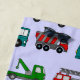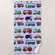 Esta toalha de praia tem um design de caminhões e ônibus novidade em vermelho, azul, verde e marrom em um campo de azul claro.
