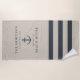 Toalha de praia náutica apresenta um estilo costeiro de barco âncora e design de listras. Personalize o texto personalizado com um sobrenome de família e casa de praia (ou outro título) com o ano de estabelecimento e localização. Esquema azul marinho e bege acessível.